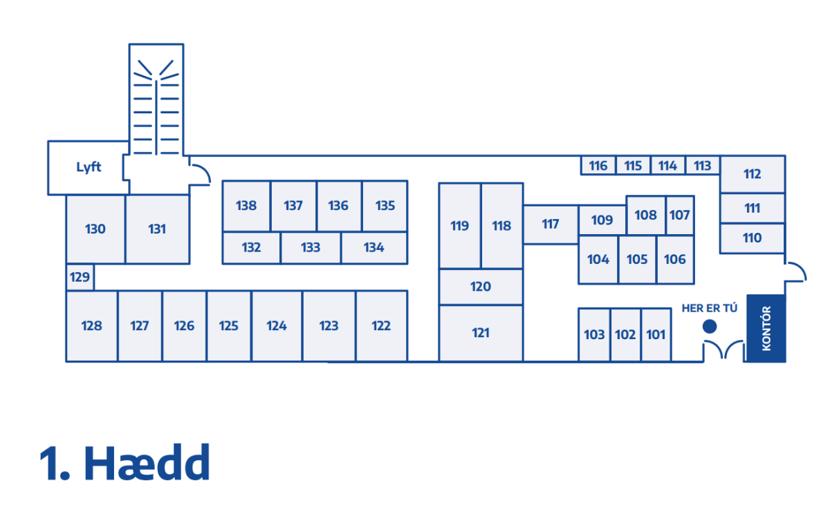 Veghæddina kalla vit 1. hædd . Tað er í hesi hæddini at inngongdin til goymsluna er. Á somu hædd finnur úr rúm 101 til 138. Vegleiðing hongur umkring í goymsluni, so tú lætt kanst finna títt rúm.